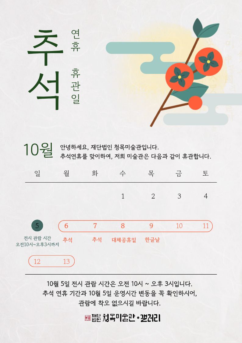 (재)청목미술관을 찾아주시는 모든 분들께 감사드리며, 풍성하고 즐거운 한가위 보내시기 바랍니다.추석 연휴 휴관 : 10월 6일(월) ~ 10월 13일(월)전시 운영시간 변동 : 10월 5일(일) → 10:00 ~ 15:00아래 추석 연휴, 휴관 및 일정 변동을 참고하시어,관람에 착오 없으시길 바랍니다.
